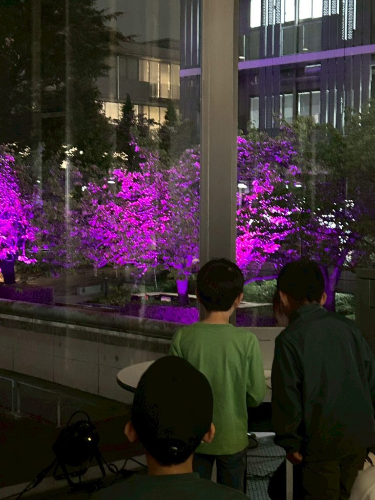 なんと、みんなの元気な声に合わせて、窓の外にある木々が一斉にライトアップされました! 声の大きさを変えると、光の色も「赤」「水色」「紫」とさまざまに変化!