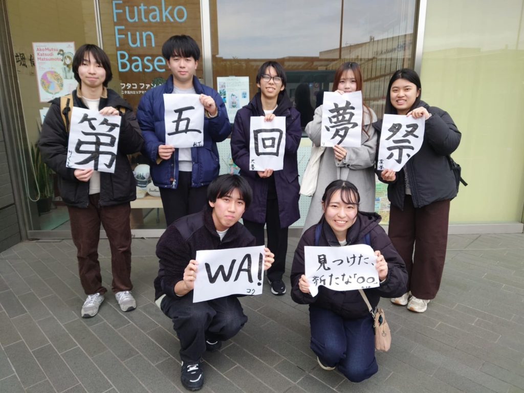 1つ目は、1月の初めに一般社団法人二子玉川エリアマネジメンツさんに挨拶しに行きました!二子玉川エリアマネジメンツさんは二子玉川地域の持続的なまちづくりを推進するエリアマネジメント団体で、第4回の夢祭の時にお世話になり今年も広報などで協力してもらう予定です!挨拶に伺ったのが年始だったので、二子玉川エリアマネジメンツさんのところで書き初めをさせてもらいました!幹部と先輩で1人1文字夢祭に関わるものを習字しました!みんな小学生ぶりの習字だったので、久しぶりの体験にワクワクしながら完成させました。