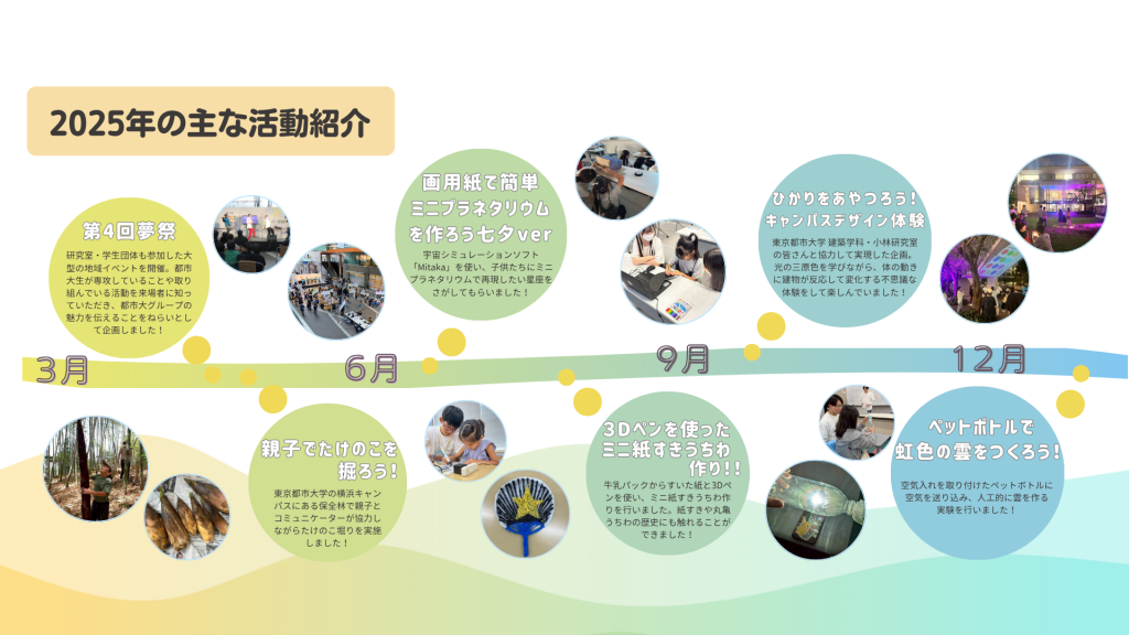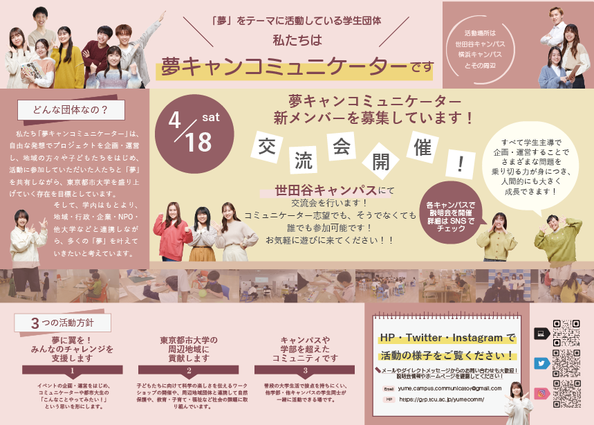 「夢キャンコミュニケーター」は、学生主体でイベントやプロジェクトを企画・運営し、さまざまな方々と「夢」を共有しながら、東京都市大学を盛り上げることを目的とした学生団体です。世田谷キャンパス、横浜キャンパスとその周辺を中心に活動しています。