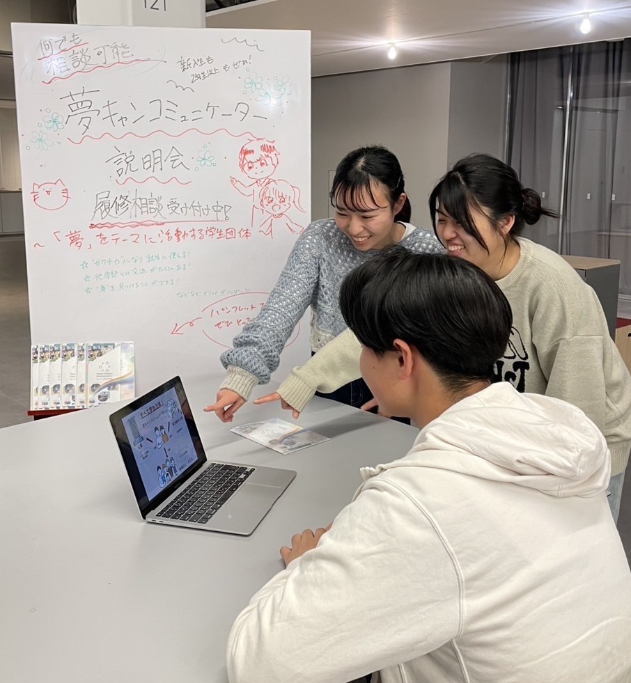 興味ある方、少しでも話を聞いてみたいという方はぜひ遊びに来てください!また夢キャンコミュニケーターは様々な学部・学科の人が所属しているので、履修登録や授業のことで分からないこと、大学生活のことでの相談等がありましたらお助けしますのでぜひお越しください!
